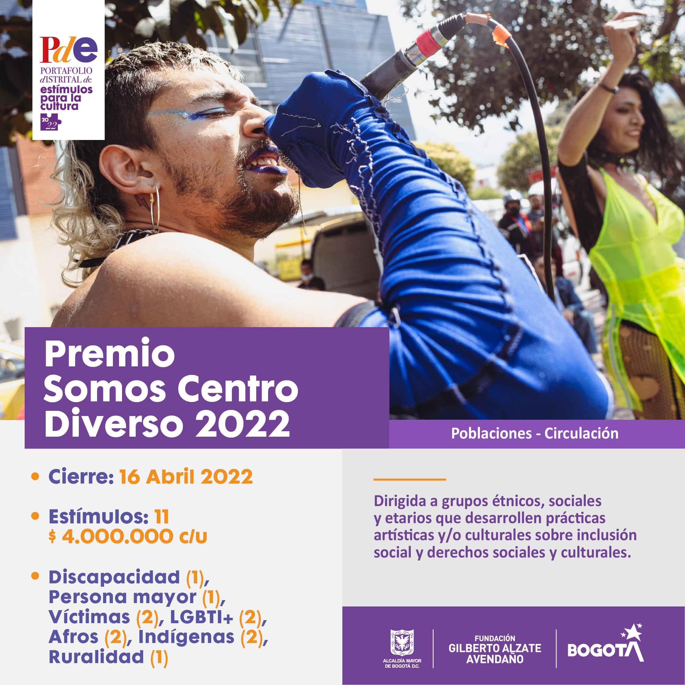 Esta convocatoria busca reconocer promover, fortalecer y visibilizar experiencias de inclusión social y de ejercicio de derechos sociales y culturales logradas mediante el desarrollo de prácticas artísticas y/o culturales de grupos étnicos, sociales y etarios. Dichas experiencias (actividades o proyectos) deben haber sido realizadas en alguna de las tres localidades del centro de la ciudad (Los Mártires, Santa Fe o La Candelaria).